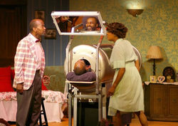Carter’s world is nicely confined to one home, a two-story building owned by Everelda (Veronica Thompson), in which her brother, Jared (Martin), is vegetating on an iron lung. Nathaniel Bellamy’s set satisfies the challenge of compressing two floors into a level-and-a-half of stage platforms, and allows Jared to remain both center stage and out of the playing area. The incapacitated Jared, once a vibrant and powerful Alpha male, is married to Billie (Nancy Renee), who, understandably, seeks other avenues for ease the challenge of being married to one so constricted. She is, however, conflicted, which produces the strange relationship with Boise McCanles (Shon Fuller) that drives the play’s arc. McCanles and his friend Lud Gaithers (Freddie DeGrate, alternating with Mark V. Jones) have arrived at the home to deliver the new television Billie has purchased for Jared’s birthday present. Rounding out the group are Everelda’s friend Zepora (Teressa Taylor) and her boyfriend, Ayton (Patterson).
